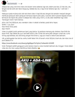 他坦言,他原本并不想分享这段视频,但眼见A小姐的欺骗行为越来越过份,“甚至针对我上一段视频而报警,因此我才会分享这一段发生于去年7月7日的事情经过”。