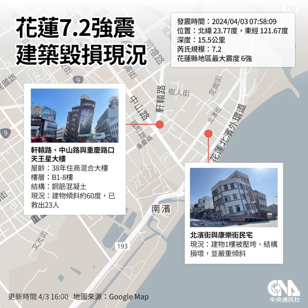 北滨街、轩辕路2栋大楼倾斜,其中轩辕路8层楼高天王星大楼救出23人、其中4人受伤幸意识清楚,最后1名受困者是花莲高农康姓女老师,警方与消防拯救人员在下午2时许发现康女身影,但身体被压住,经确认已身亡。