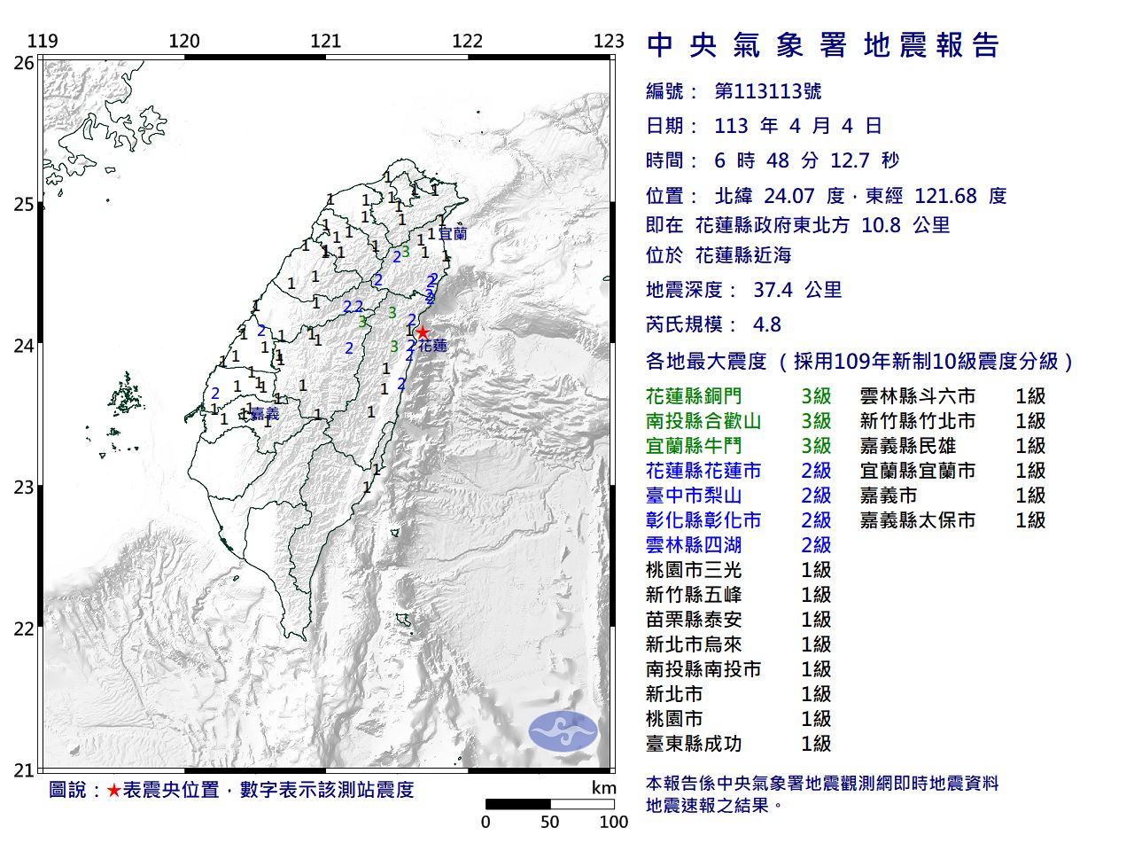 台湾地震 | 截至06:48am 花蓮近海規模4.8地震 最大震度3級