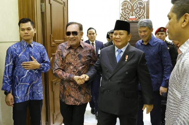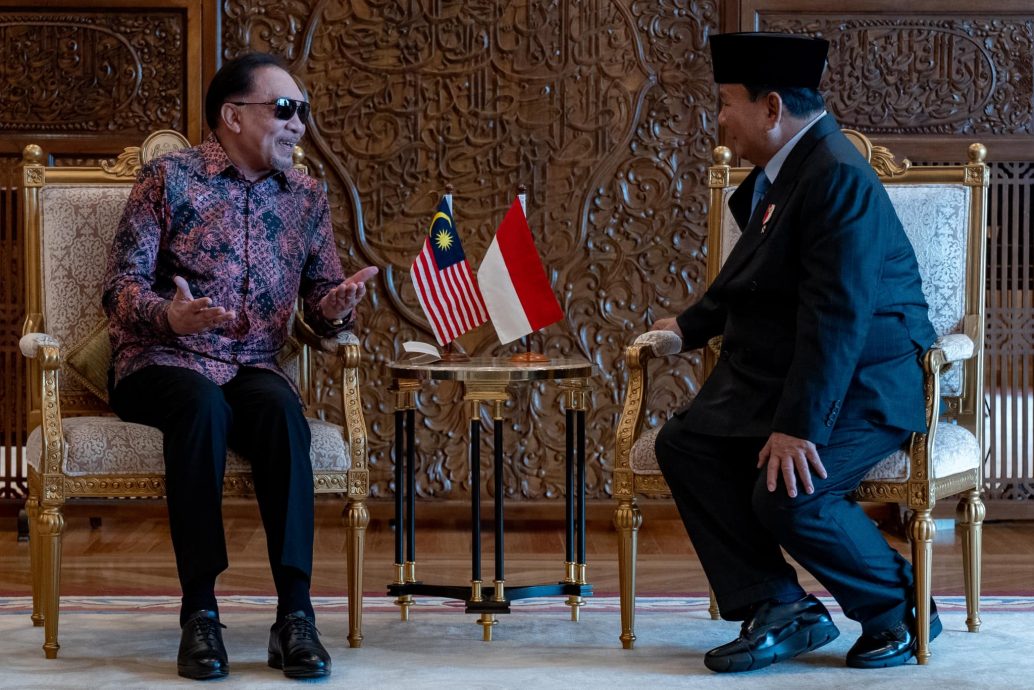 (八打灵再也4日讯)首相拿督斯里安华今早在首相署与印尼当选总统兼国防部长普拉博沃会面后,在个人脸书分享了多张会面的照片,由于安华全程都戴着墨镜,引起网民的关注。