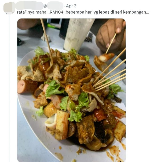 不过,有一网民竟声称,自己在史里肯邦安一处吃的Colek,价钱竟然更夸张,一盘要价104令吉,感叹如今食物价格高涨。