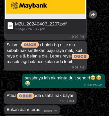 他说,临近开斋节,他便请7位欠他钱的朋友还债,但只有2人回复,其余5人都“失联”不回信。