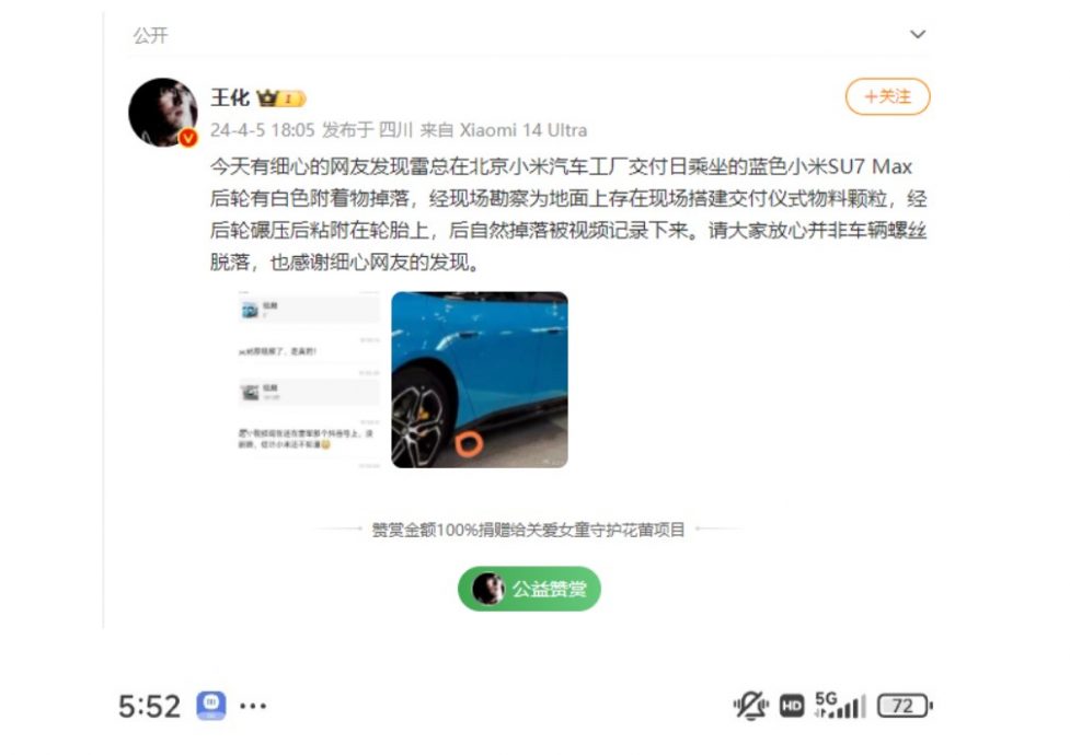 小米集团公关部总经理王化周五在微博发文称,有细心的网民发现雷军在北京小米汽车工厂交付日乘坐的蓝色小米SU7 Max后轮有白色附着物掉落。经现场勘察,地面上存在现场搭建交付仪式物料颗粒,经后轮碾压后粘附在轮胎上,后自然掉落被视频记录下来。