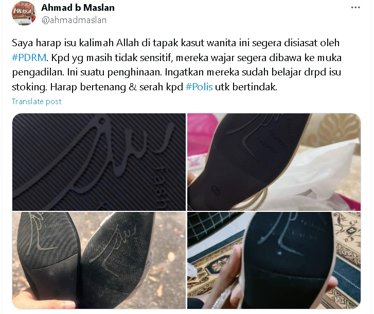 鞋底被指印“真主”字眼 马斯兰促警方立即调查