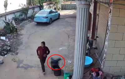监控画面显示,男童在院子里玩耍,随后试图爬上水桶,没想到下秒一头栽进水桶里,导致他上半身溺在水中,双脚在空中不断挣扎乱踢,但都无法脱离水桶。