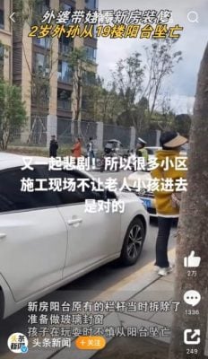 (四川9日讯)中国一名2岁男童被带去看新房装修,结果从19楼意外坠楼身亡,引发当地社会热议。