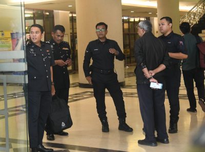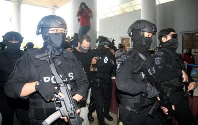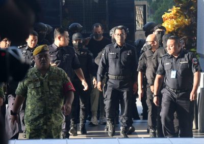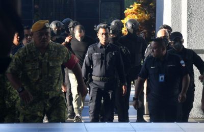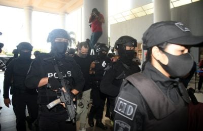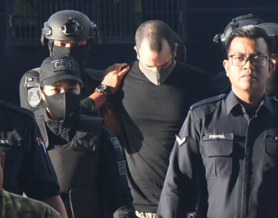 抵达吉隆坡法庭大厦后,嫌犯由大批全副武装的警方押送。