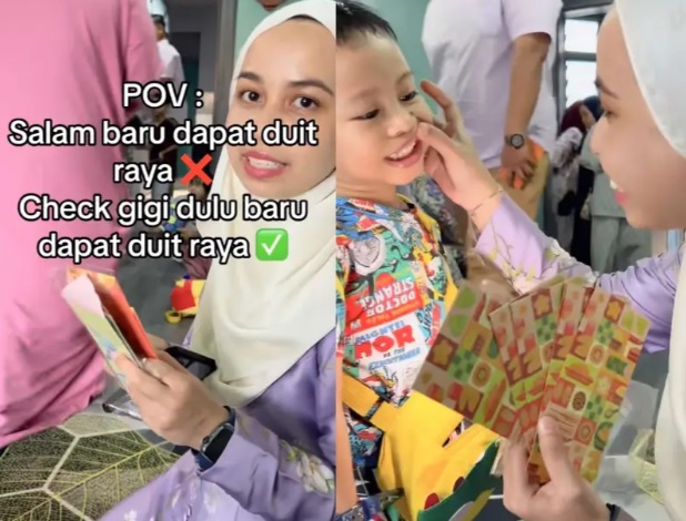 (八打灵再也12日讯)本地一名女医生在开斋节派发青包给亲友的孩子们时,职业病发作,先要一一检查他们的牙齿后才给青包,这逗趣的画面让网民爆笑。