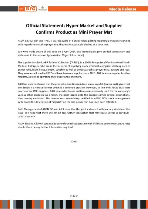 文告表示,Aeon BiG是在4月9日得知此问题后,立即向柔佛州伊斯兰宗教局(JAINJ)提供全面的合作与解释。