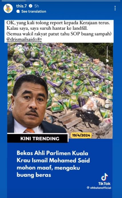殿下通过其Instagram 限时动态贴文说,依斯迈赛益应该直接通知政府,并将垃圾送往垃圾填埋场。