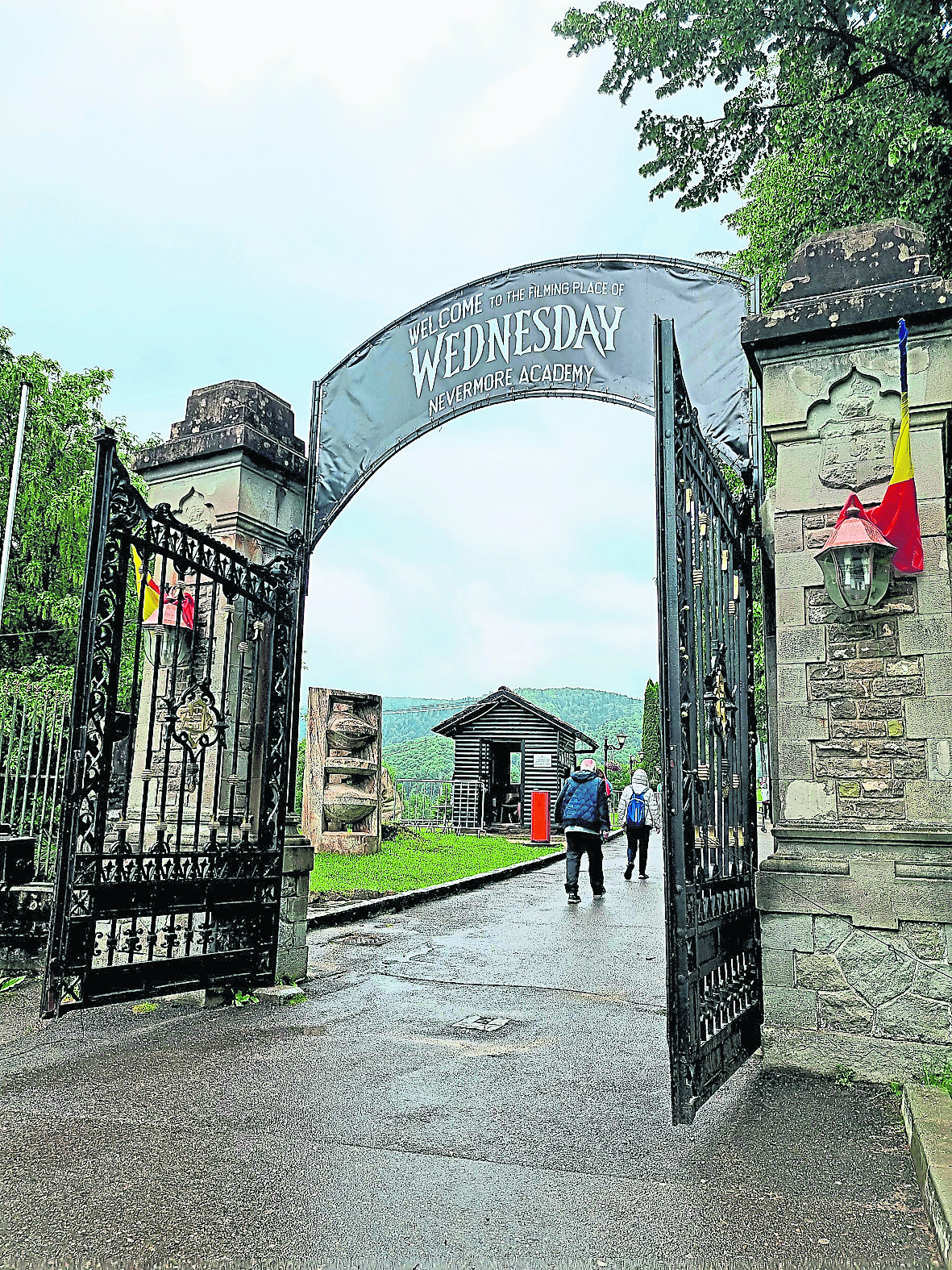 讽刺的是,没多少人会关注城堡的历史,倒是大家更关注“星期三”曾在哪个角落出现过。这也是为何,城堡范围内有许多供拍照的影集看板,让影迷们在主角出现过的地方拍照,同时更解释了,为何城堡大门的铁栏不见“坎塔库奇诺城堡”的字样,反而标明了这里是“Nevermore学院”,然后还特别写上“欢迎来到‘星期三’的拍摄地点”。