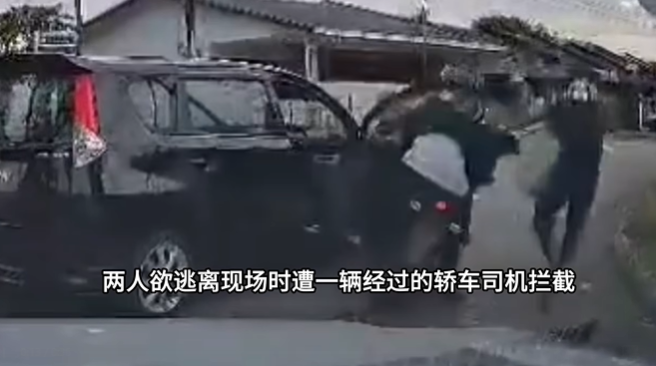 另一辆轿车司机果断停在路边,以迅雷不及掩耳之速冲下车推撞两名劫匪,才致使两人来不及骑车逃走。