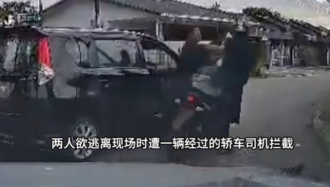 路过的轿车司机立即驱车接近,并且鸣笛警告劫匪,但后者仍跳上摩托车准备逃走。