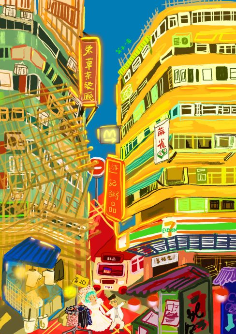 穿着80年代的婚纱站在旺角街头,旁边有架满竹架子的商店,后面是吵杂的街市。经过的路人有些投以异样眼神,有些开心的投来祝福。