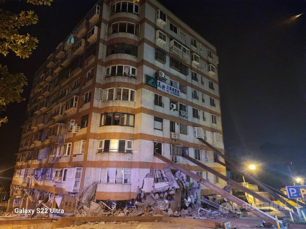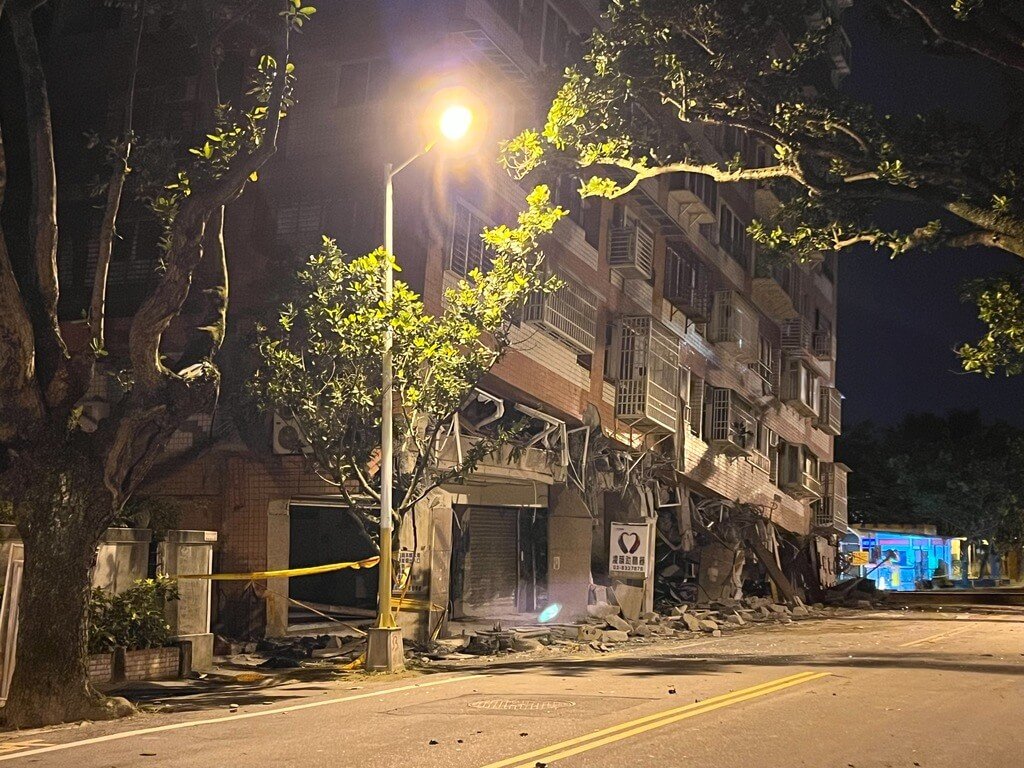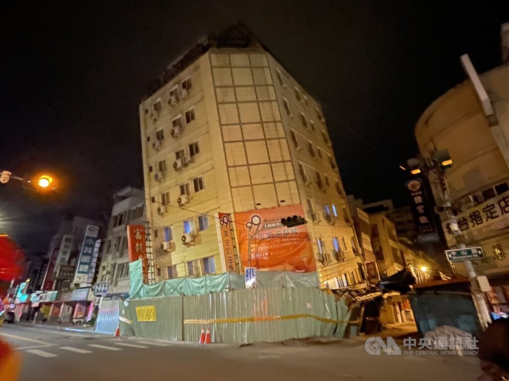花莲市明礼路的红单建筑物统帅大楼,原本是已被县府列拆除的建筑物之一,已在附近拉起封锁线,23日又因地震而倾斜。(中央社·花莲县消防局提供)