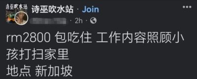 该招聘文写道:“2800令吉,包吃住,工作内容照顾小孩、打扫家里,地点:新加坡。”