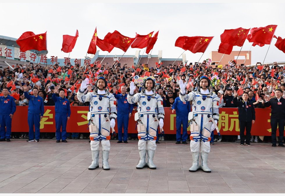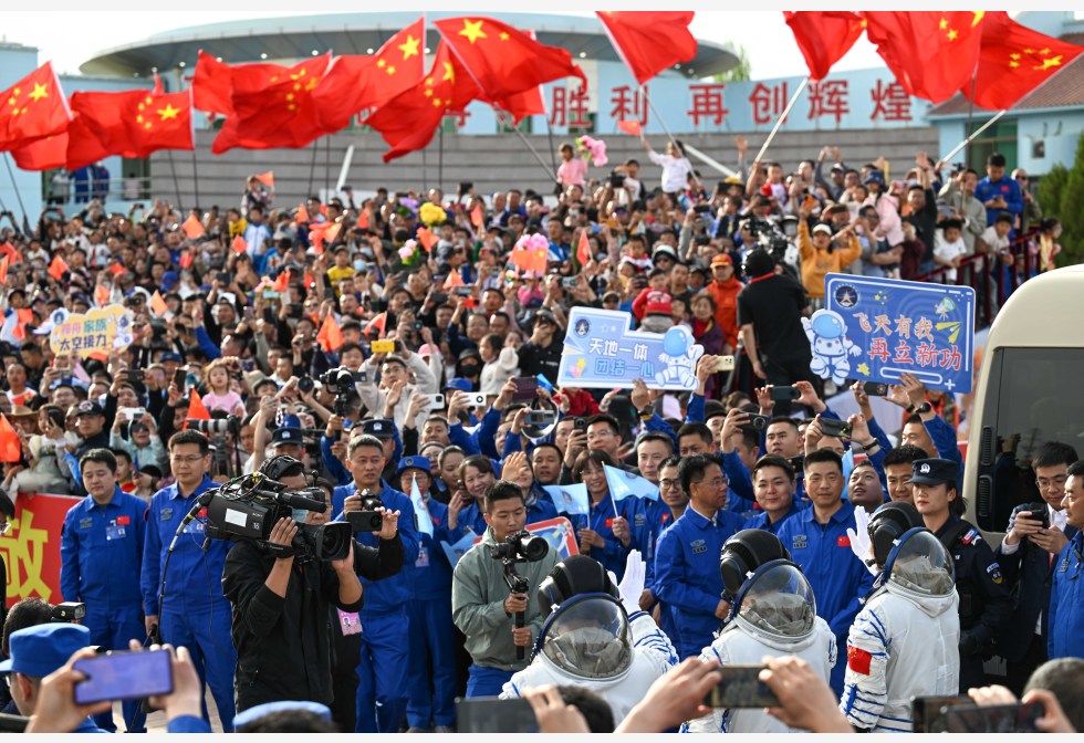 神舟十八号载人飞行任务太空人乘组出征仪式周四下午在酒泉卫星发射中心问天阁圆梦园广场举行。中央军委装备发展部部长、中国载人航天工程总指挥许学强下达“出发”命令,叶光富、李聪、李广苏3名太空人领命出征。3名太空人坐车前往发射塔架,沿路有大批民众欢送。