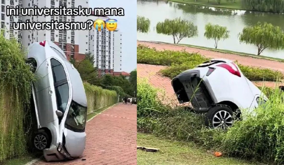 TikTok帐号@innavoig_9日前上传的视频,显示在雪邦的大学内发生一起罕见的轿车坠毁事故,画面显示事发点靠近湖畔的人行道。