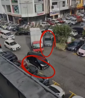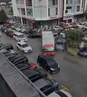 视频显示,罗里打算往左拐弯,无奈左边有一辆轿车停放在拐弯处,罗里前方又有一辆汽车双重泊车,导致罗里无法顺利拐弯。