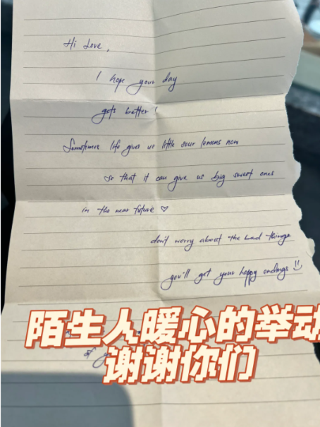 手写的纸条写道,“嗨亲爱的,我希望你的日子会越来越好。有时候生活会给我们一点酸柠檬,因为它会在不久的未来,给予我们丰硕甜蜜的果实!别在意现在不好的事情,你将会迎来美好的未来。”