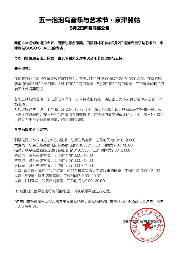 (天津/台北27日综合电)台湾金曲歌后田馥甄(Hebe)原定于5月2日登天津泡泡岛音乐与艺术节演出,但是主办方在今晚9时突然发布通告表示,因活动筹备原因,田馥甄将不参加当天的表演。对于无法依约跟歌迷们见面,田馥甄随后在微博贴文坦承很遗憾,“但心还是热的,歌还是在唱着,我们后会有期 ”安抚歌迷。