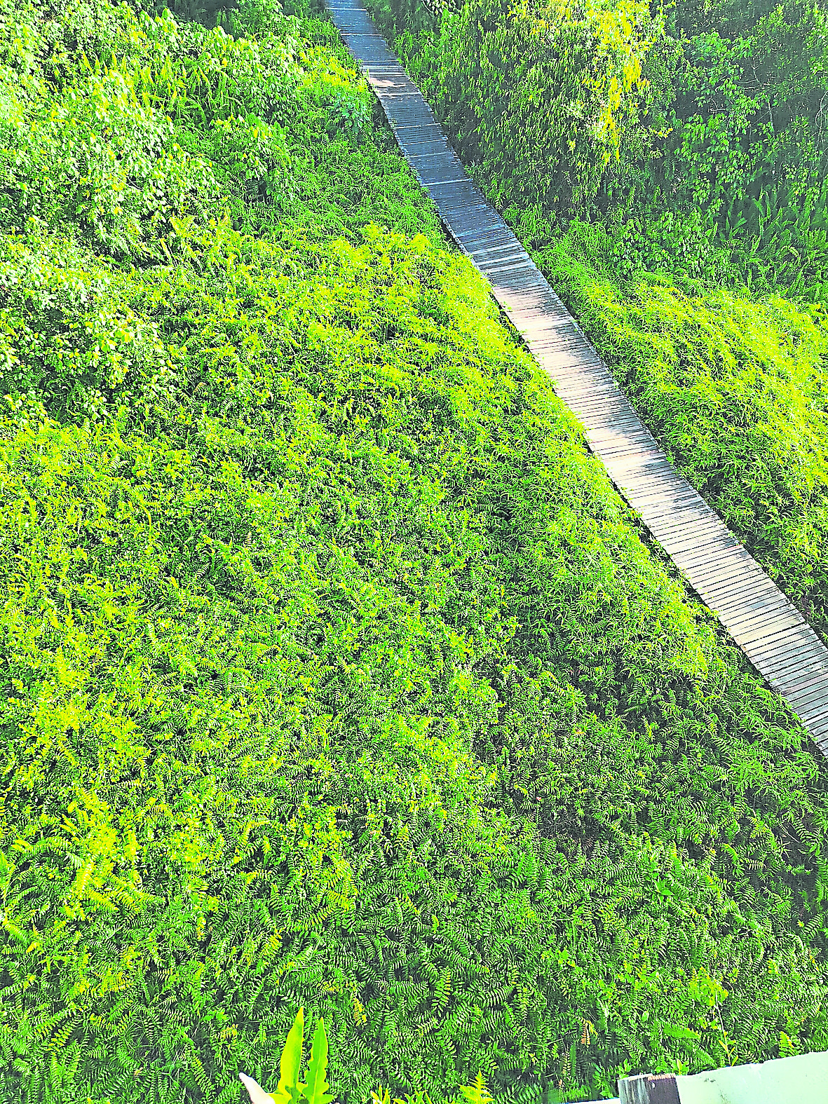 “来,把这些叶子采回去给妈妈煲水来喝,可以减少关节疼痛。”老板兴致勃勃地手里棒着一捆大片叶子交给我。