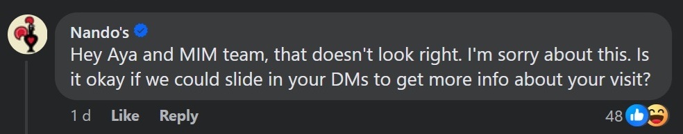 不过,Nando’s随即针对投诉做出留言,做出道歉并承认这看起来非常不对劲,要求女子提供信息,以做进一步的跟进。