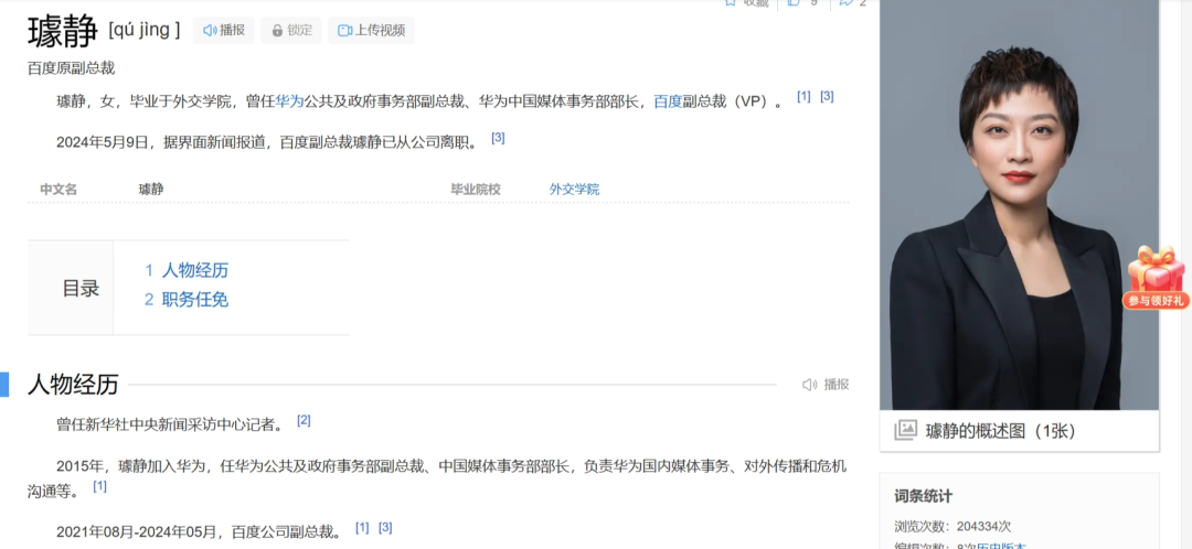 (北京9日综合电)中国媒体报导,日前在镜头前发表刻薄言论的百度集团副总裁、公关部门最高主管璩静,周四(9日)已经从百度离职,记者查询百度百科发现,璩静的个人资料已经发生更改,显示为“百度原副总裁”。与此同时,在人物经历一栏显示:“2021年08月—2024年5月,百度公司副总裁”。
