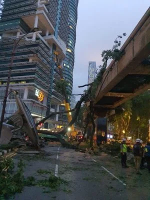 一棵位于吉隆坡苏丹依斯迈路的数十尺高的大树,昨天下午2时许在一场大雨中突然倒下,砸中来往方向至少17辆车,并且造成1死1伤悲剧。
