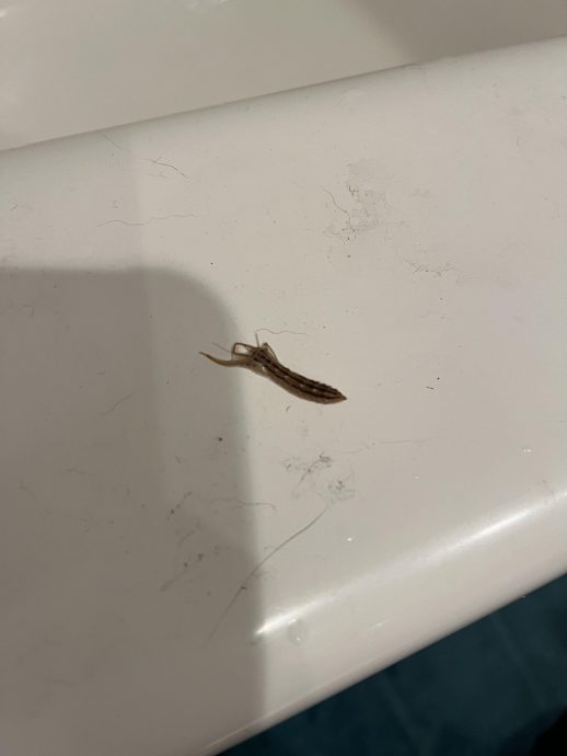 照片显示一只拥有很长的前足的虫子,而靠近排水口有一些细小的虫肢。