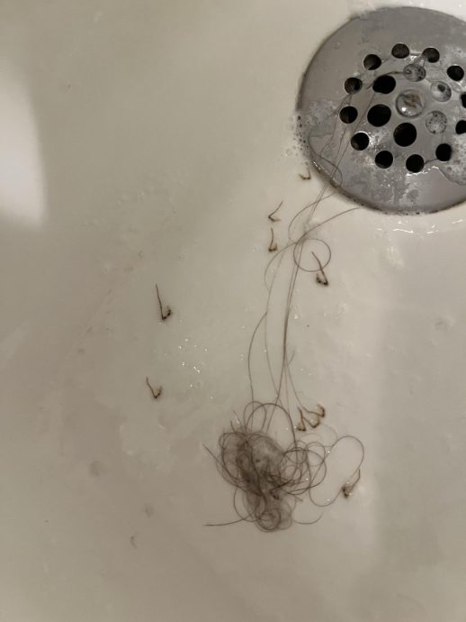 社媒Reddit用户发帖求助,称洗头时发现有很多虫子掉到地板上,包括一只大虫及很多的小虫。