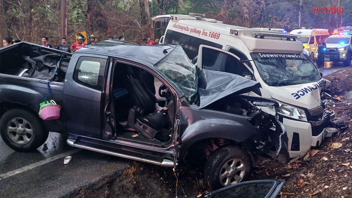 (清迈11日综合电)一辆皮卡车疑因雨天路滑,失去控制下猛撞上一辆正飞驰驶往医院的救护车,造成5人身亡,包括救护车上一名即将临盆的准妈妈一尸两命,另有6人受伤。