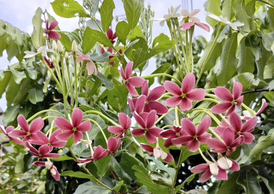 多年以后的最近,我则在新村的一户人家外头,有缘见到使君子的原植物,见识到它的花卉艳丽。 尤其是穗状的白色花瓣会逐渐变色,即从初始的白色慢慢转变为粉红色,最后才变为红色。 而花色一旦转变为红色则会倒挂下垂,相当引人瞩目。