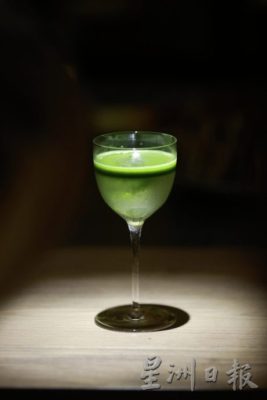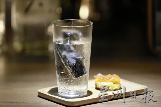 这杯特调的外观看似透明,喝了一口,却透出一丝清香茶味。叫人惊艳的是杯中的昆布,他先用火枪炙烧昆布,再置放在特调上面,让它在饮料里面释放鲜味(Umami)。如果一口气喝完,会感觉到一股清凉舒爽。