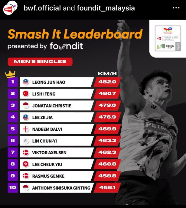 大马男单李梓嘉则以时速476.9公里排名第4。