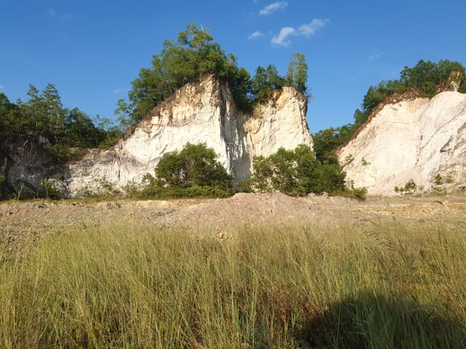 友人都不愿意相信眼前所见,我们便商议往前探访,走进这片未知里。走了几分钟,我们便看见原先被遮挡视野的山壁后,有个意想不到的小水洼,水洼前便是一片长至人腰部的芒草。我瞥见隆起的堤岸边有未除尽的长椅椅腿,同时顺着视线看见地上深深浅浅的车辙,有些疑惑。这地面布满嶙峋的石头,显然不适合让车子行驶,但我接下来便得到答案。我走到中间的小山坡上眺望远方,接着我的目光很快地锁定远处山壁的阴影处,那里有台挖掘机,而它正安静地蛰伏。