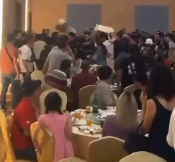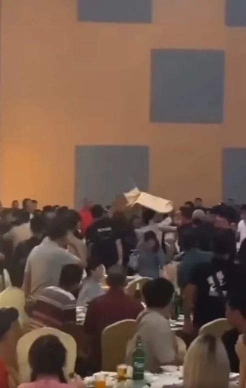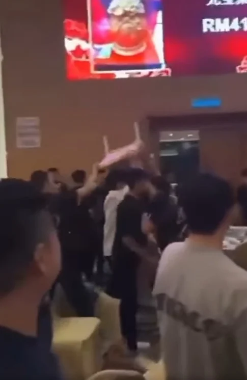 网络疯传一段18秒的视频,可见两班人马不知何故在宴会厅里大打出手,期间还有椅子乱飞互砸,吓得其他宾客慌乱逃走。