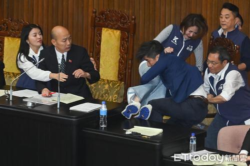 国民党为议事顺利进行,昨早占领主席台,确保立法院院长韩国瑜顺利上台主持议事。当院会处理到报告事项第48案时,国民党团提议重付表决,蓝委从主席台返回座位按铃时,民进党立委趁机发动攻势,兵分多路冲向主席台,多数遭蓝委阻挡,仅钟佳滨突破重围,跃上主席台并扑倒陈菁徽,导致她从桌上摔落到椅子上,再重铁到地上,且过程触碰到陈菁徽臀部,涉嫌性骚。