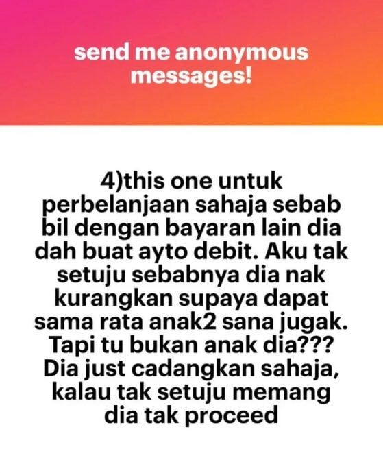 她说,削减成5000令吉的家用,自己只会收到2000令吉,另外各1000令吉是由孩子享有。