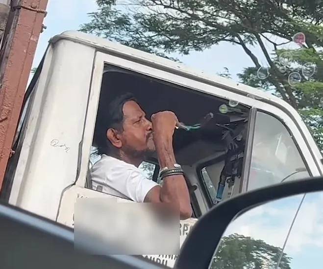 根据《Utusan TV》分享的视频,显示罗里司机困在车龙中,完全塞着不动,于是按下了车窗,把手臂靠在车门上透气。