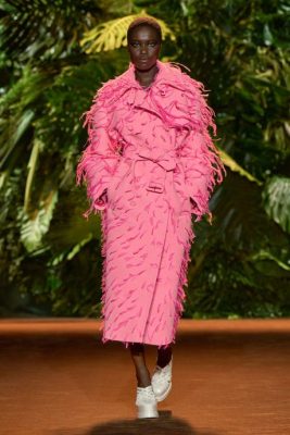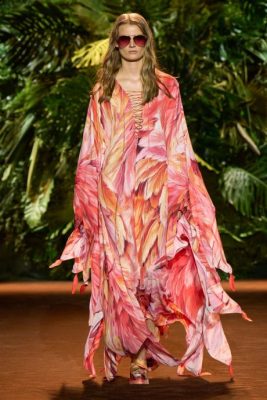 系列设计夺目耀眼,尽显Roberto Cavalli野性贪玩的奢华风格。精美的雪纺长袍充满了羽毛风格的设计,无论是不对称缝边的火焰剪裁还是Cavalli的全新羽毛印花,由淡紫色的小闪光或红色、粉色、白色和石灰色调的手绘羽毛,纯熟的工艺,令人赞叹。激光切割的细小羽毛,轻盈的感觉和诗意的图形,摇摆着身躯,翩翩起舞,风情万种。狂野而又精致,在幻想的翅膀上绽放永恒优雅的无限魅力。