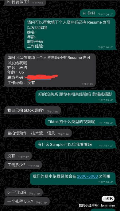 脸书用户自称是新媒体公司,正在招聘全职剪辑师或摄影师,并透过脸书贴文,分享他与一名求职者通过WhatsApp的对话截图。
