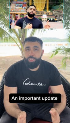 拥有380万粉丝的阿德拉蒂夫今午在TikTok上传视频,为自己早前在黑风洞印度庙宇和云顶高原一间华人寺庙前背诵《可兰经》的视频,作出真挚的道歉。