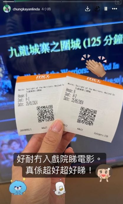 此外,最令人惊喜的是,锺嘉欣在限动分享2张电影门票,原来是去欣赏旧爱伍允龙有份演出的新作《九龙城寨之围城》,并大赞电影:“好久没有进戏院看电影。真的超好超好看!”