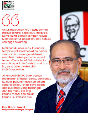 纳扎里今日在Instagram上发帖澄清,BDS从未呼吁大马人杯葛KFC,而是因为顾客抱怨其昂贵的价格才选择不购买,并非出自以巴战争问题。