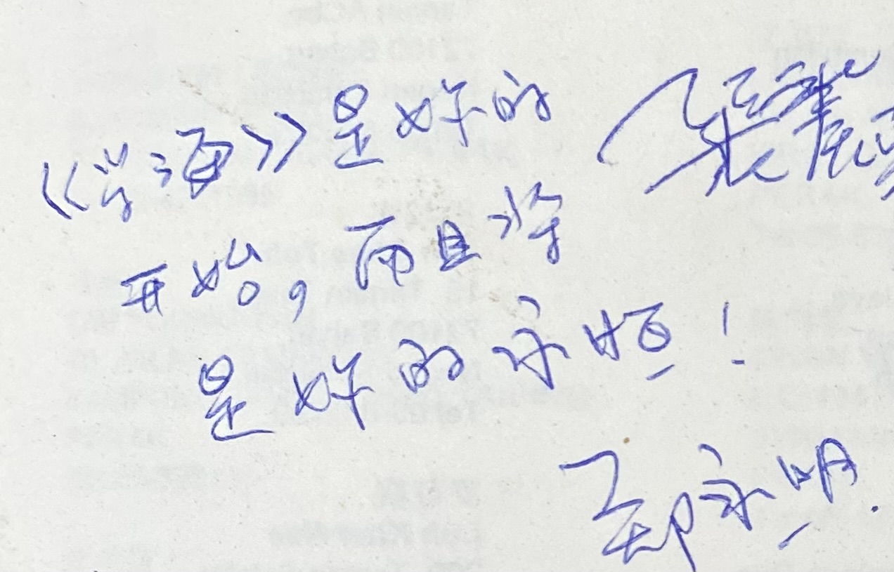 永明大哥,也许你不知道,在学记队的生涯里,让我留下最深刻记忆的就是你当年留下的笔迹。在我第一次参加第五届全国营的时候,你在我的全国营手册里写下:“《学海》是你的开始,而且将是你的永恒!”从那时开始,学记生涯是我中学最闪耀的时刻。