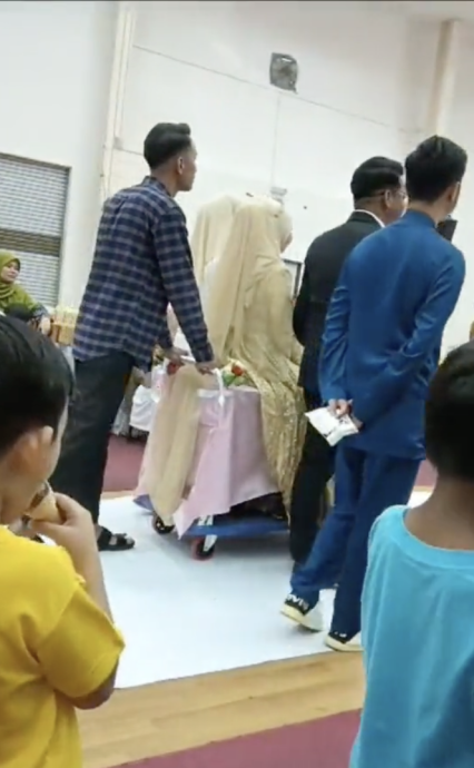网传一段33秒的视频,显示一名女子身穿一袭淡橙色婚纱,在亲友的帮助下,在婚礼现场坐在手推车和丈夫一起入场。