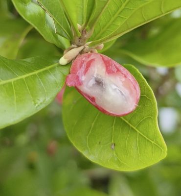 原来这棵植物的本名叫“奇迹果”(Miracle Fruit)。 虽然果肉酸涩,但含有糖蛋白(Miraculin),能影响味蕾。 即吃了这果子大概半小时后,如吃酸味之品,会发现这酸味啊在霎那变成甜味。