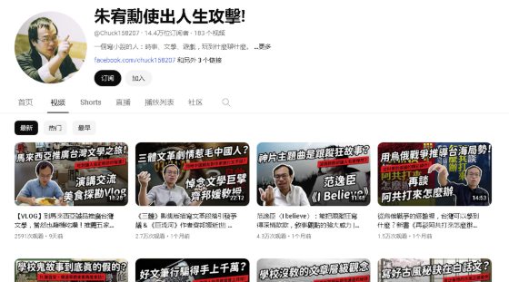 在“朱宥勋使出人生攻击!”YouTube频道里,朱宥勋会用文学理论分析电子游戏、流行歌曲,也会深入浅出讲解许多人搞不懂的文学概念,好让文学更贴近大众,更贴近日常。