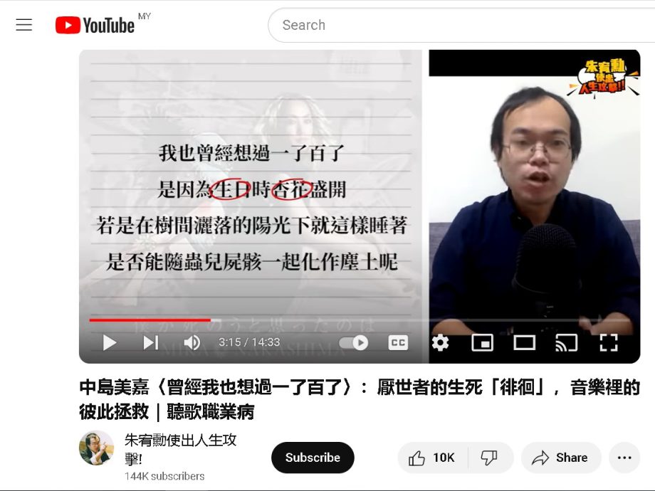 印象深刻的,是他在解析中岛美嘉〈曾经我也想过一了百了〉歌词的影片结尾,回应关于文学与自杀的课题时,他是这么说的: